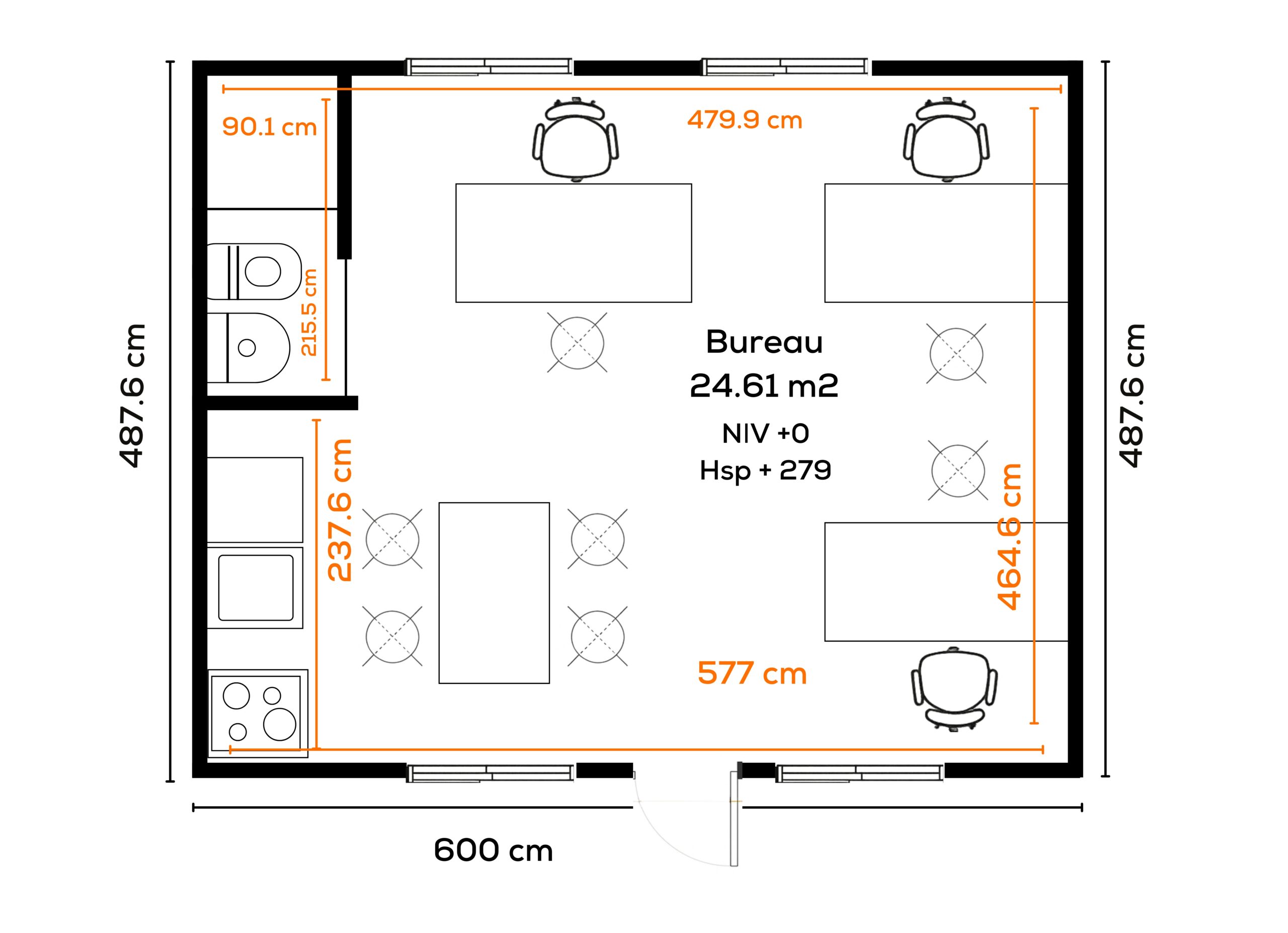 Un module fonctionnel équipé de bureaux, sanitaires et coin cuisine.