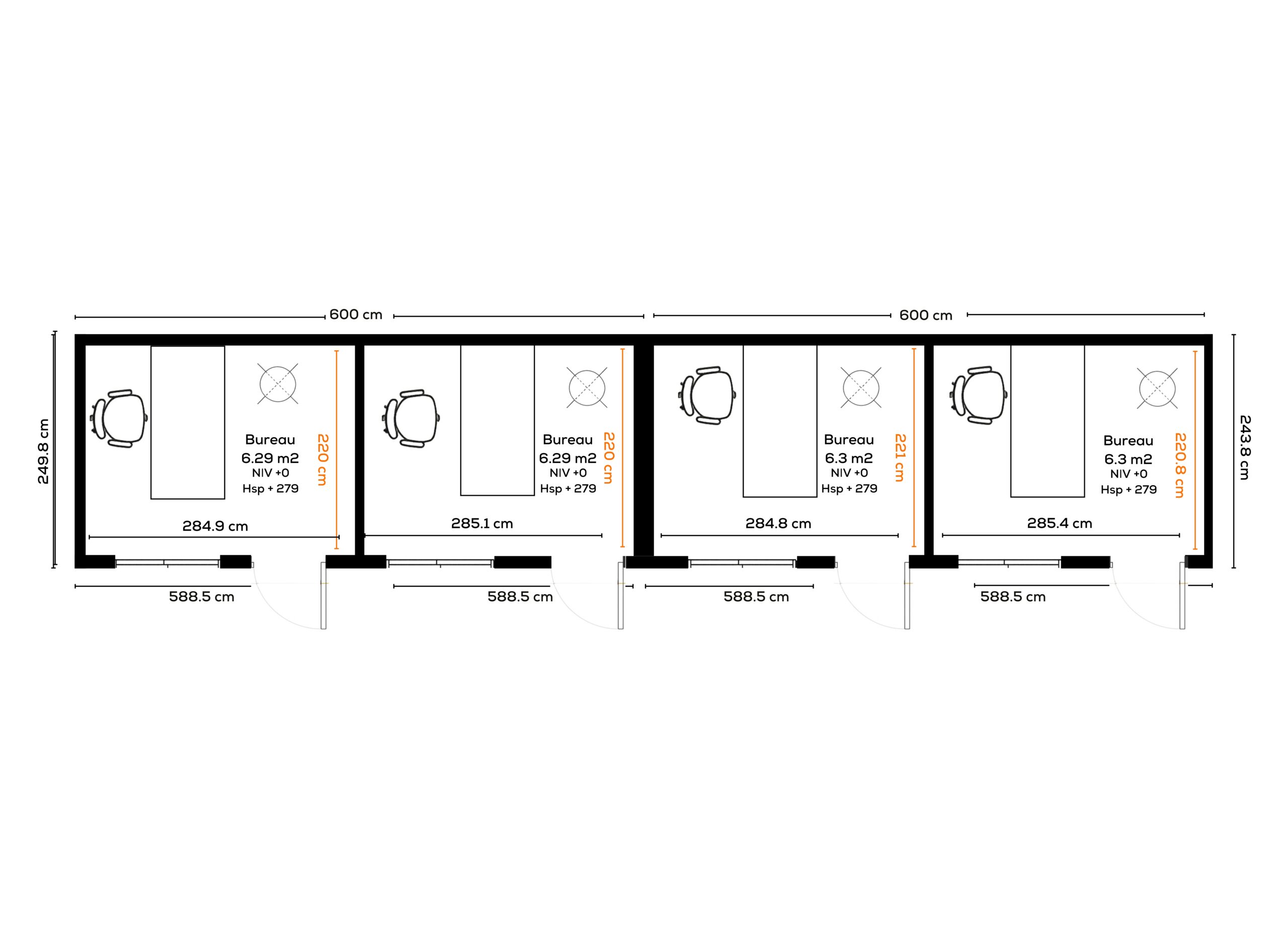 Un long module conçu pour accueillir quatre bureaux cloisonnés.