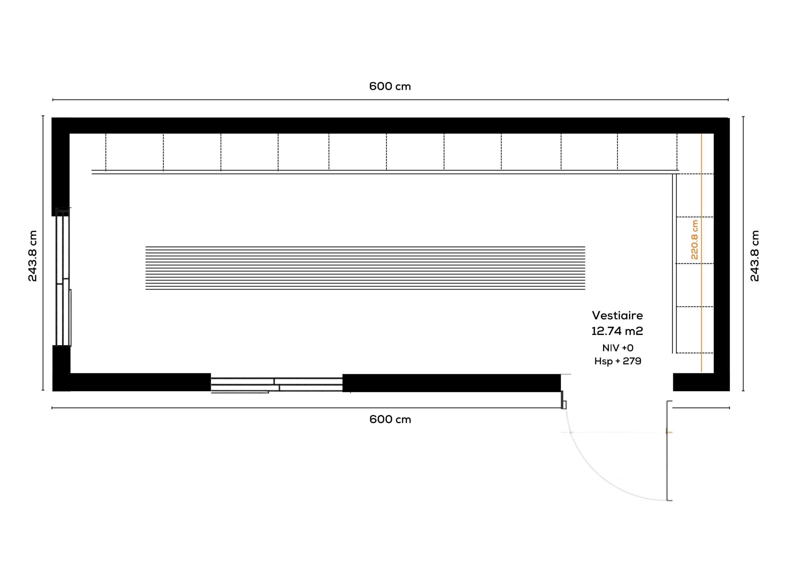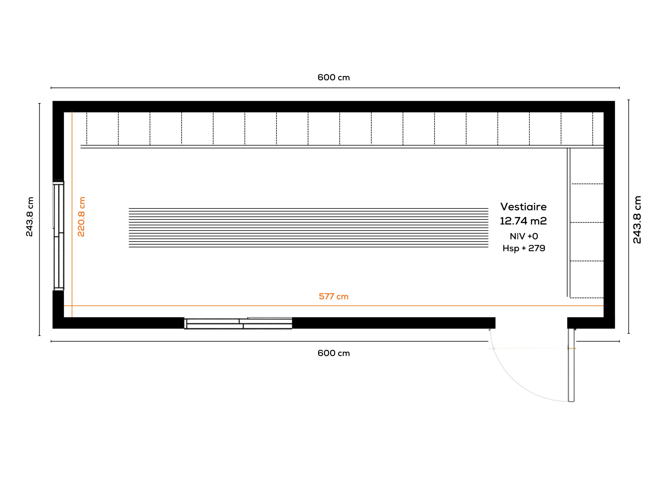 Un vestiaire modulaire spacieux pouvant accueillir une équipe complète.